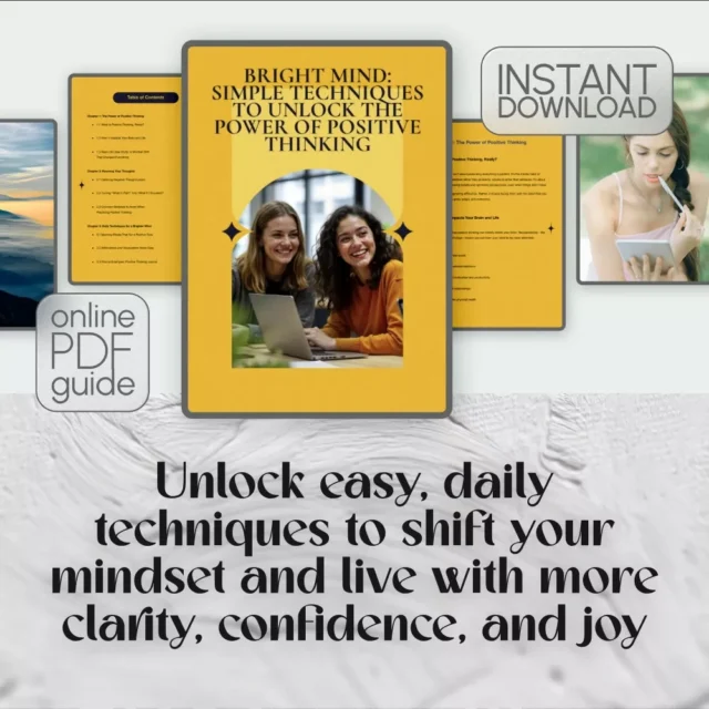 Struggling to silence negative self-talk or break free from unhelpful thought patterns? “Bright Mind: Simple Techniques to Unlock the Power of Positive Thinking” is your clear, compassionate guide to transforming the way you think—one easy-to-follow step at a time. This beautifully designed digital download is packed with practical tools and real-life strategies to help you harness the proven power of positive thinking. Whether you’re new to mindset work or looking to deepen your routine, this positive thinking technique guide will light the way forward with clarity and encouragement.