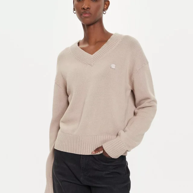 Calvin Klein Jeans Women’s Beige Cotton Knitwear V-Neck Long Sleeve Sweater
