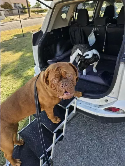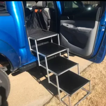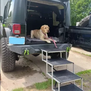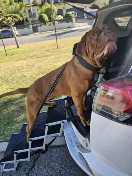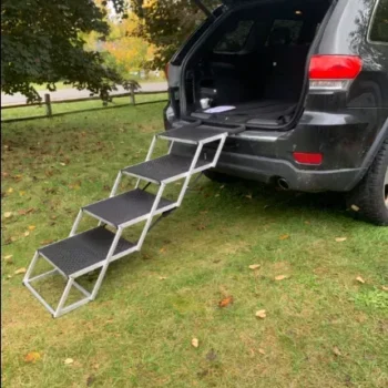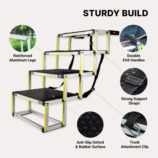 Crafted with a robust aluminum alloy frame, this car dog ramp offers exceptional strength and stability, capable of supporting dogs weighing up to 250 lbs. It includes a non-slip Oxford & rubber surface and secure car attachments to ensure your pet’s safety.