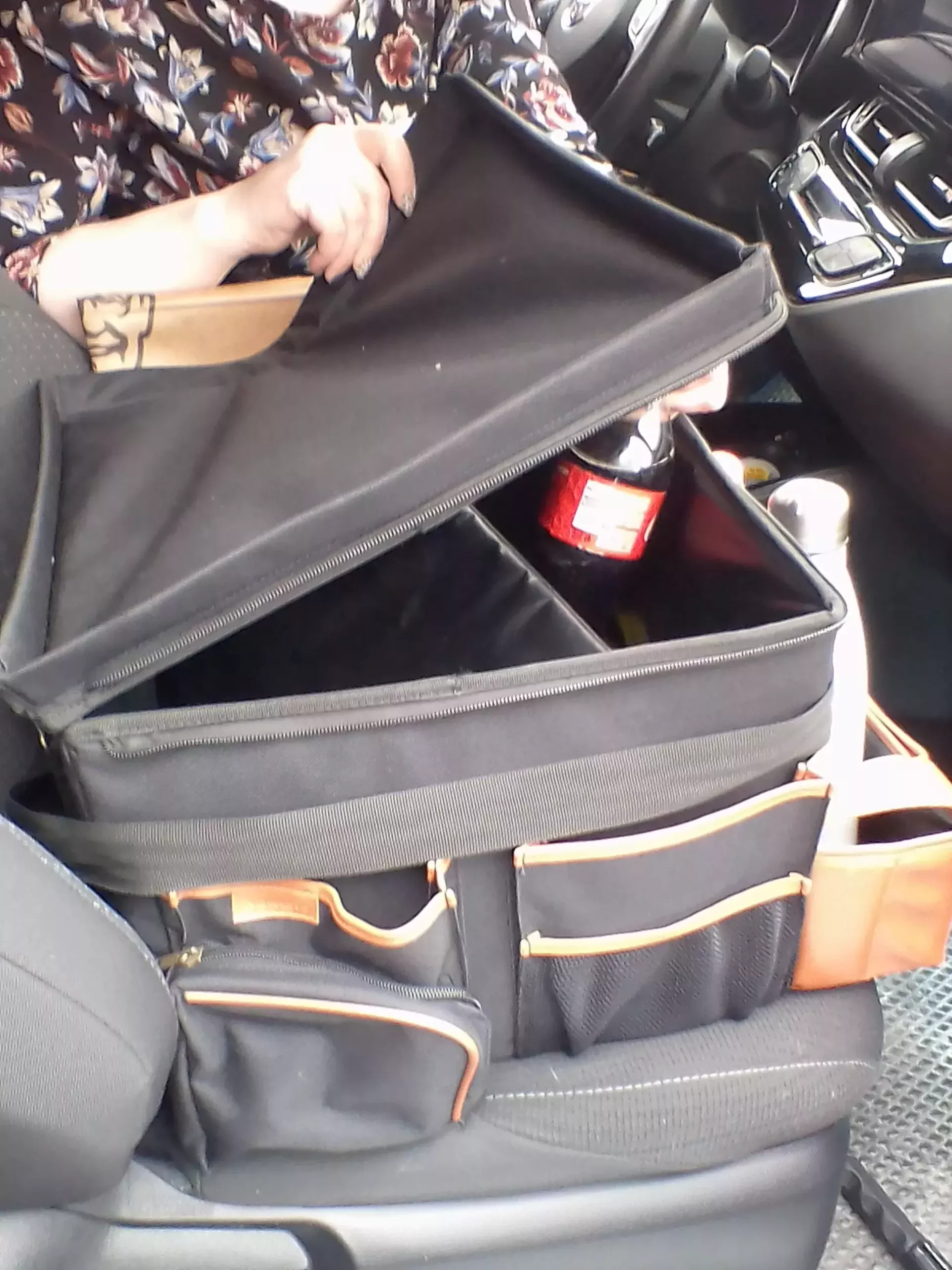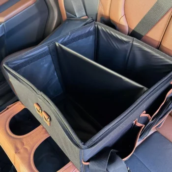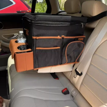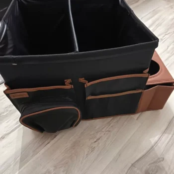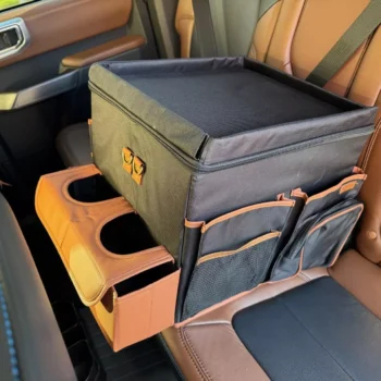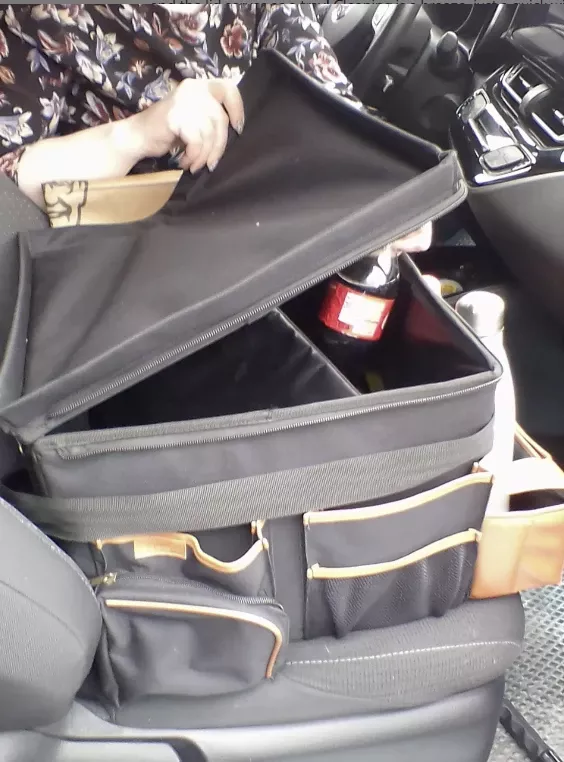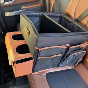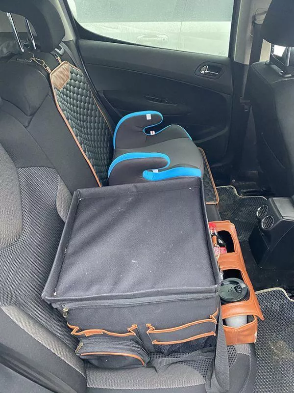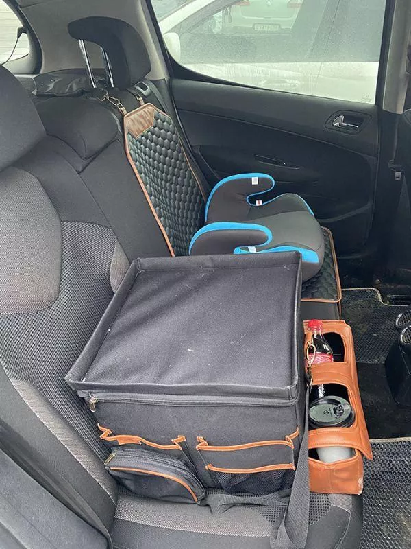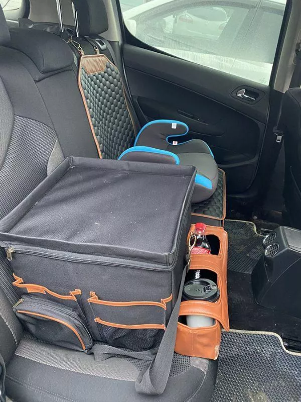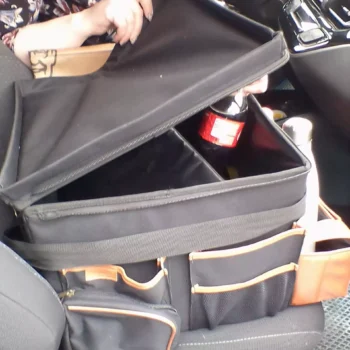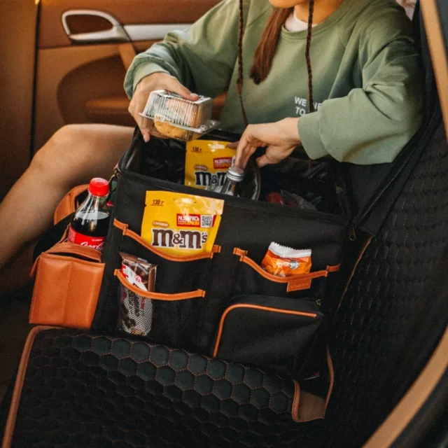 Large compartment with a removable divider, eight side pockets and two front pockets can hold everything you need on the road – from drinks to gadgets. It is suitable for all car models, and you can use it in your front seat, back seat, or even in the trunk. Plus, the lid works as a backseat table!