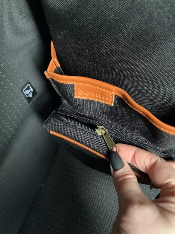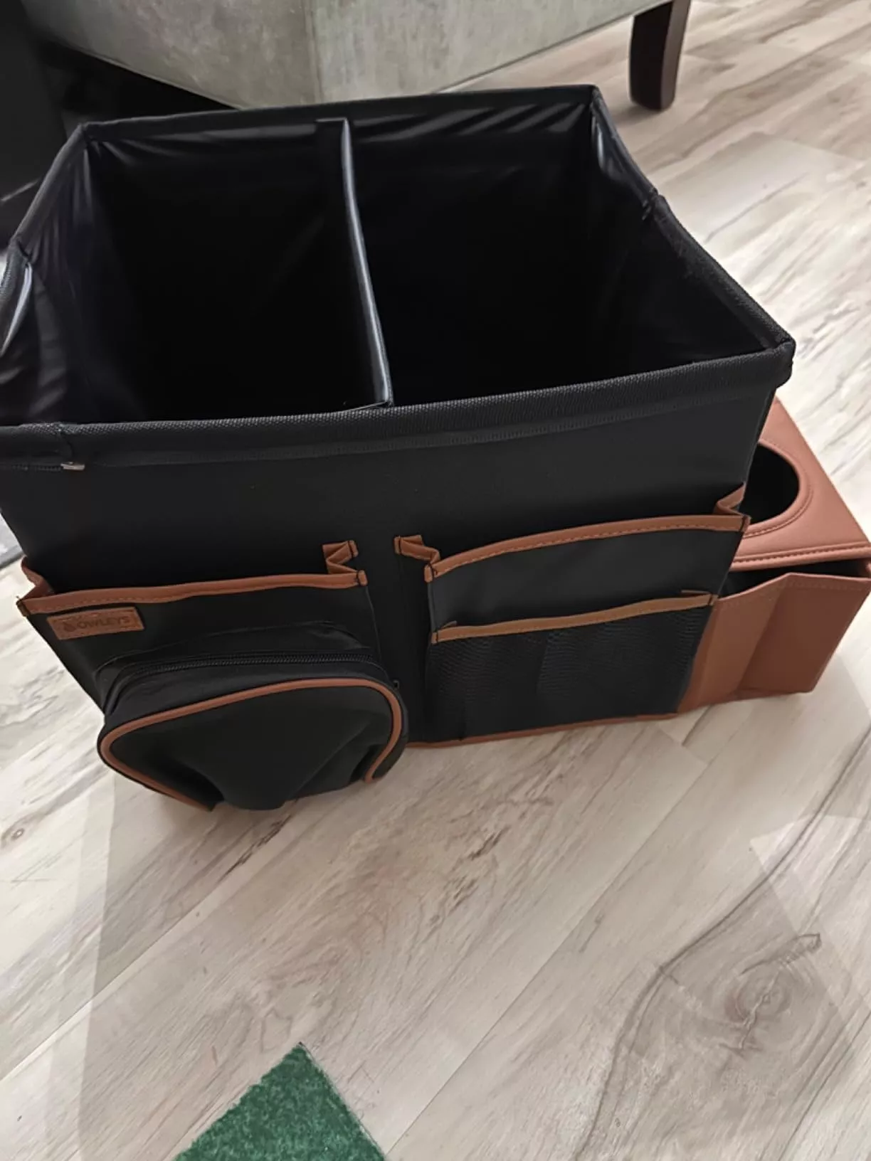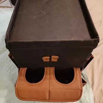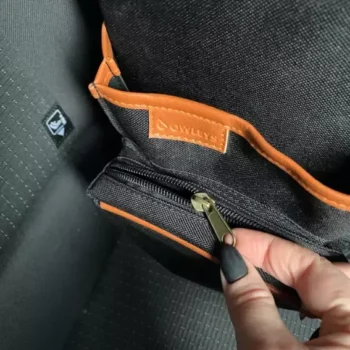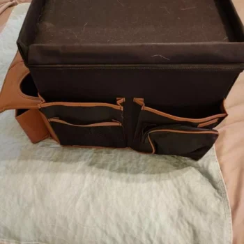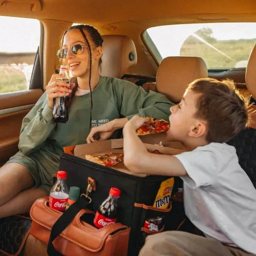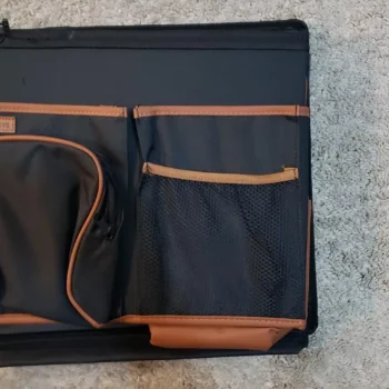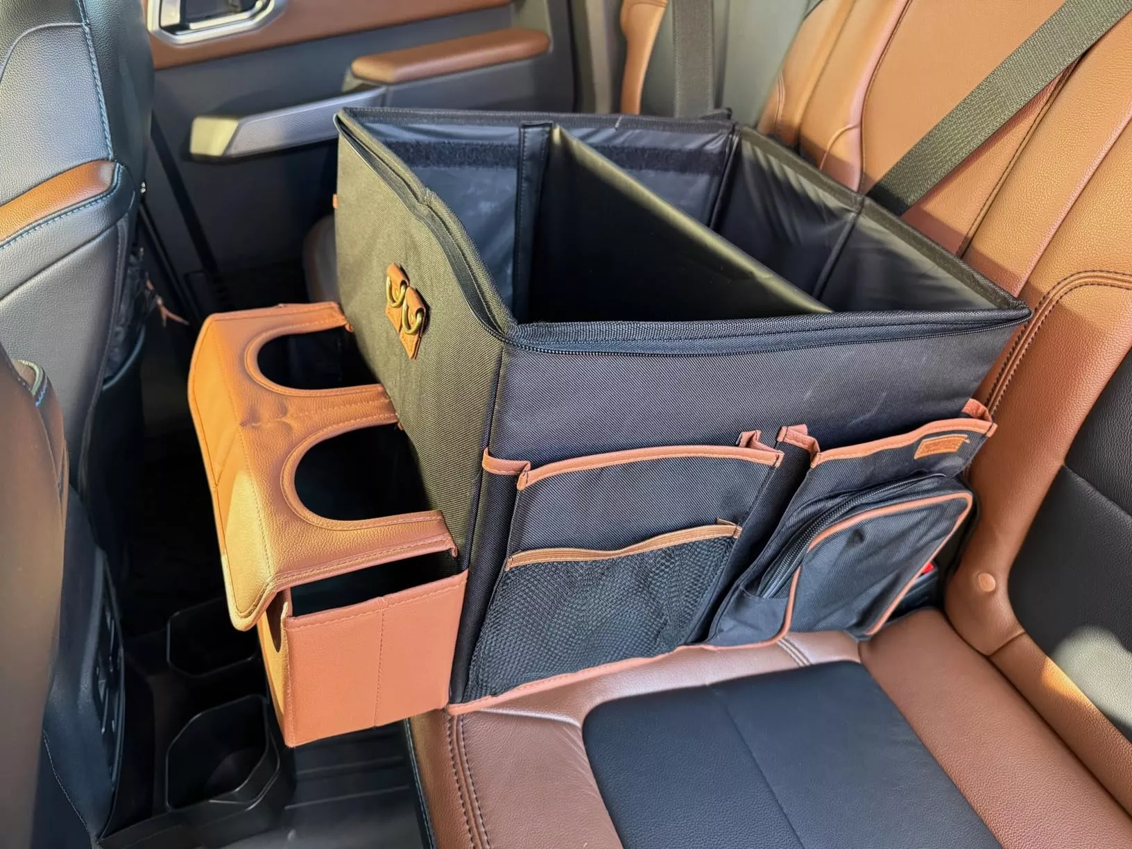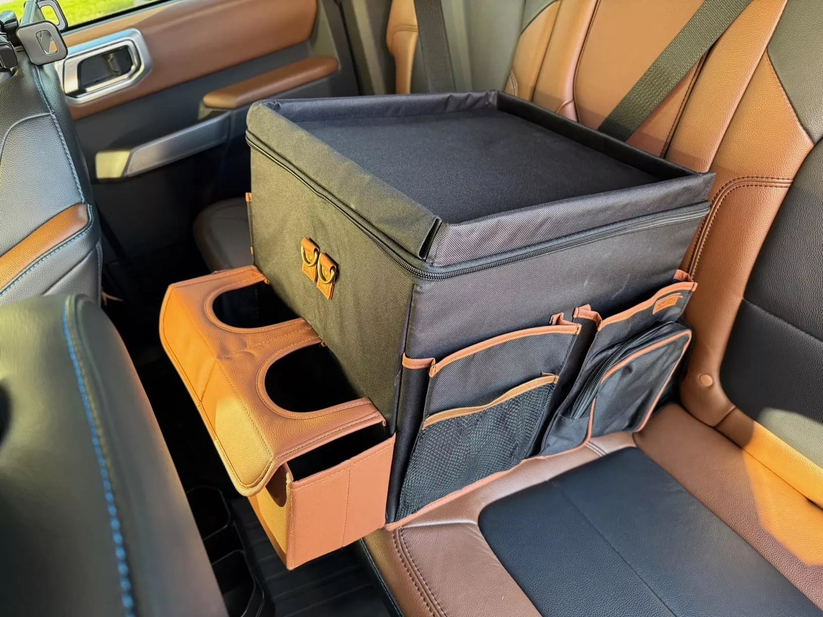 Large compartment with a removable divider, eight side pockets and two front pockets can hold everything you need on the road – from drinks to gadgets. It is suitable for all car models, and you can use it in your front seat, back seat, or even in the trunk. Plus, the lid works as a backseat table!