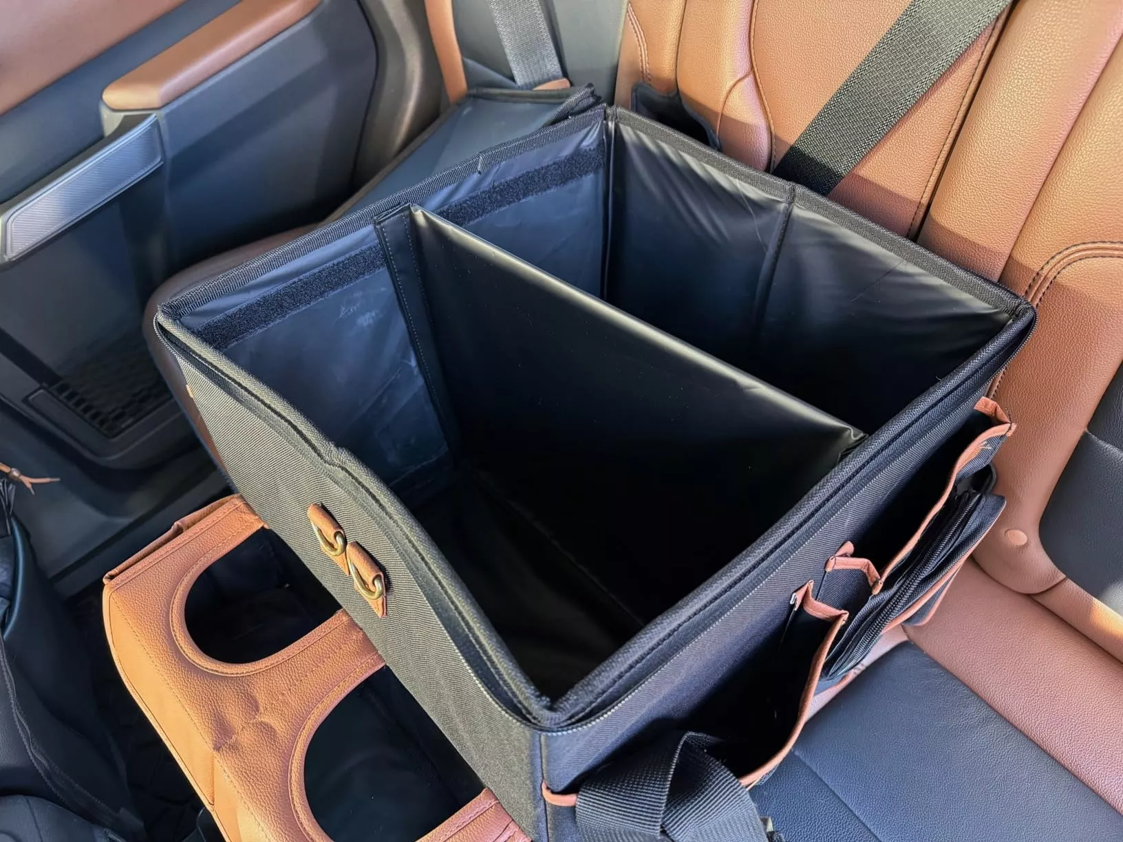 Our Magic Box organizer is fully collapsible – you can easily fold it up when not in use to save space. Plus, it fits perfectly between two child seats or two passengers in the back!