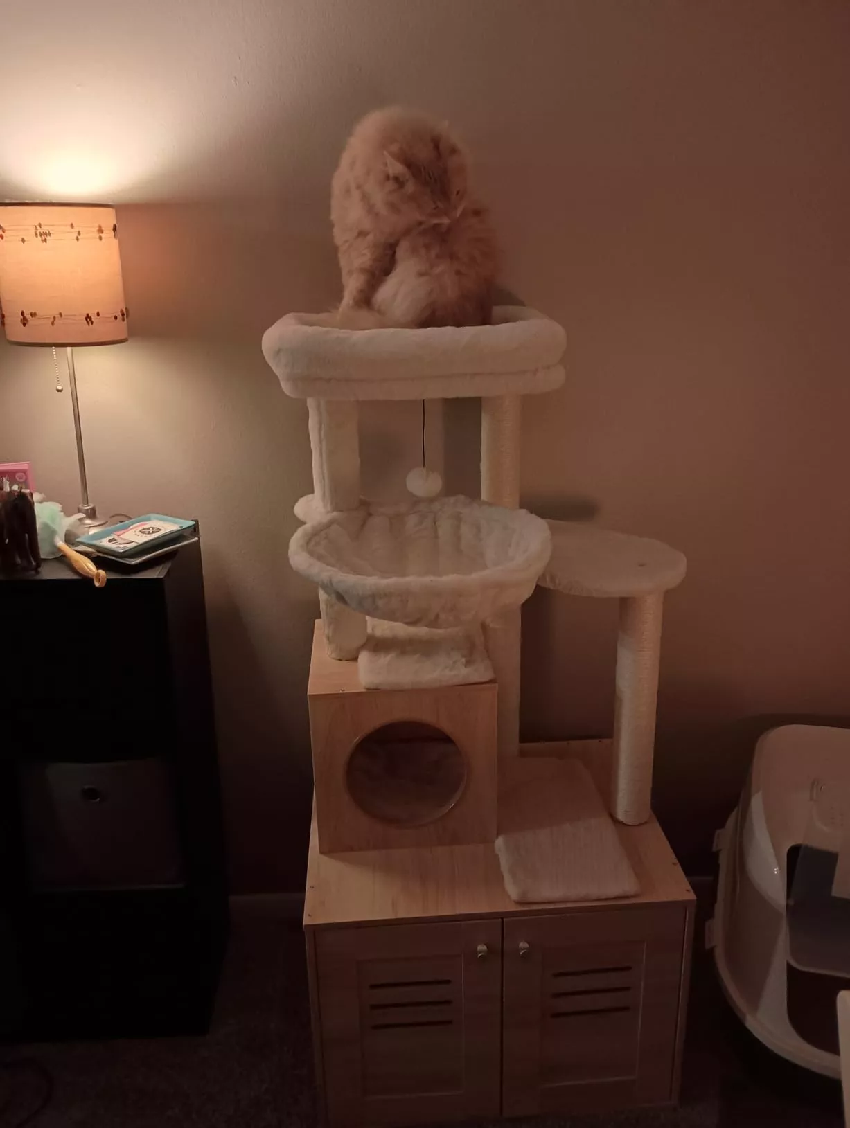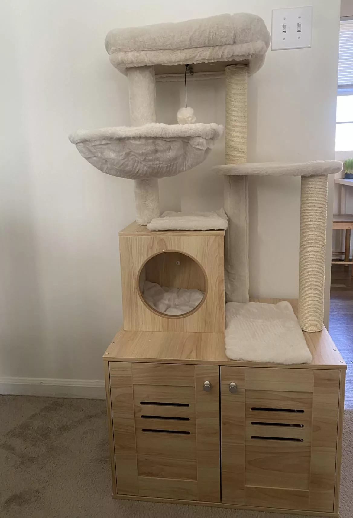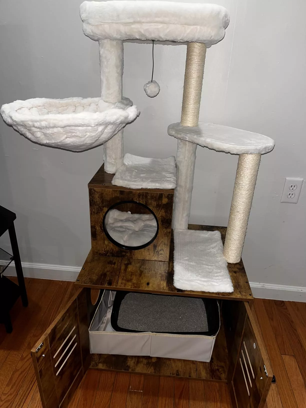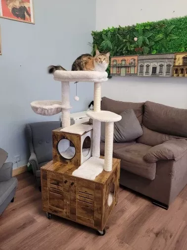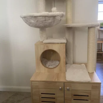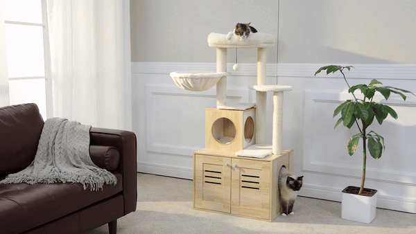 • Features a large, spacious cabinet that can double as a cozy sleeping area or house a litter box.