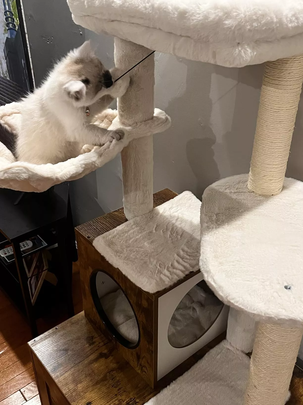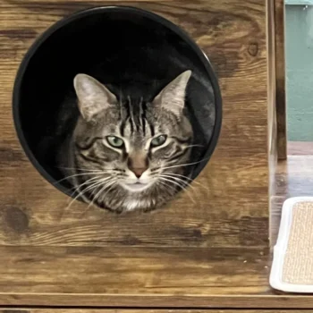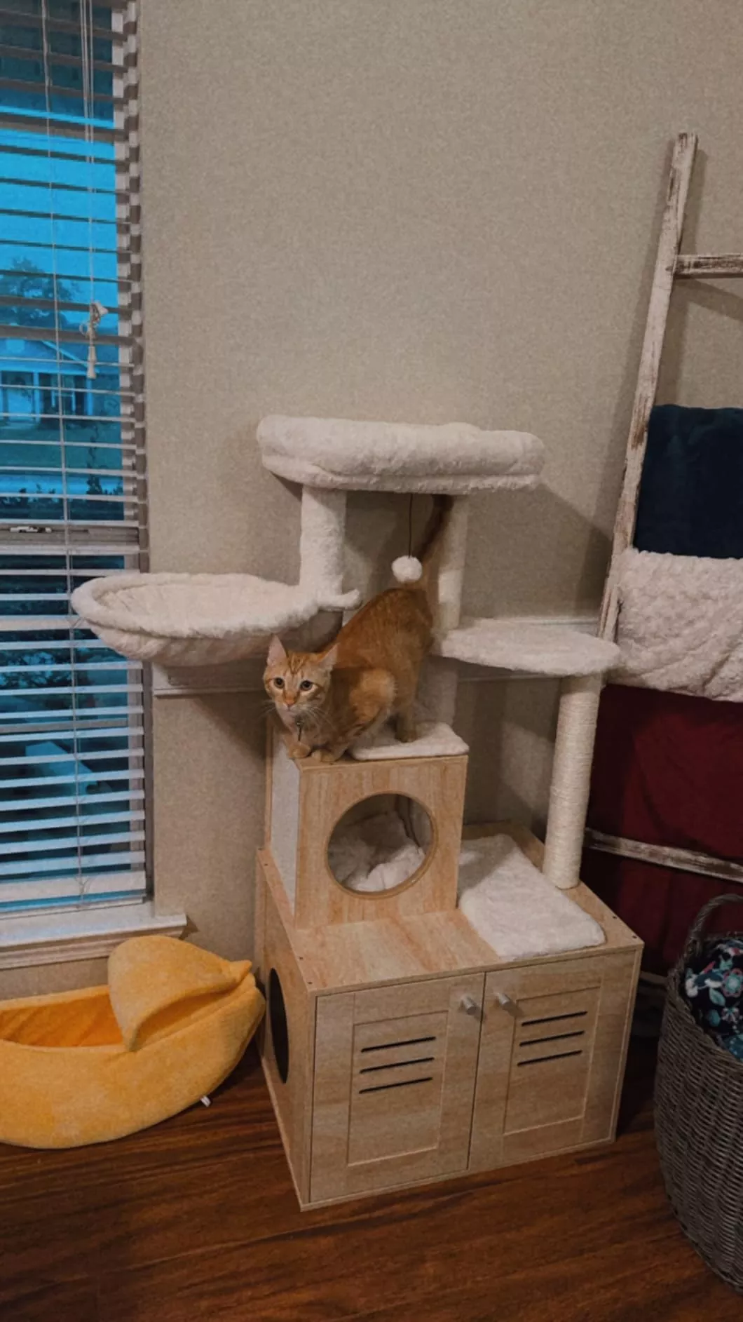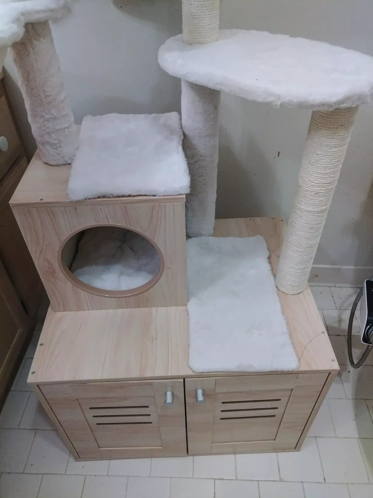 • Features a large, spacious cabinet that can double as a cozy sleeping area or house a litter box.