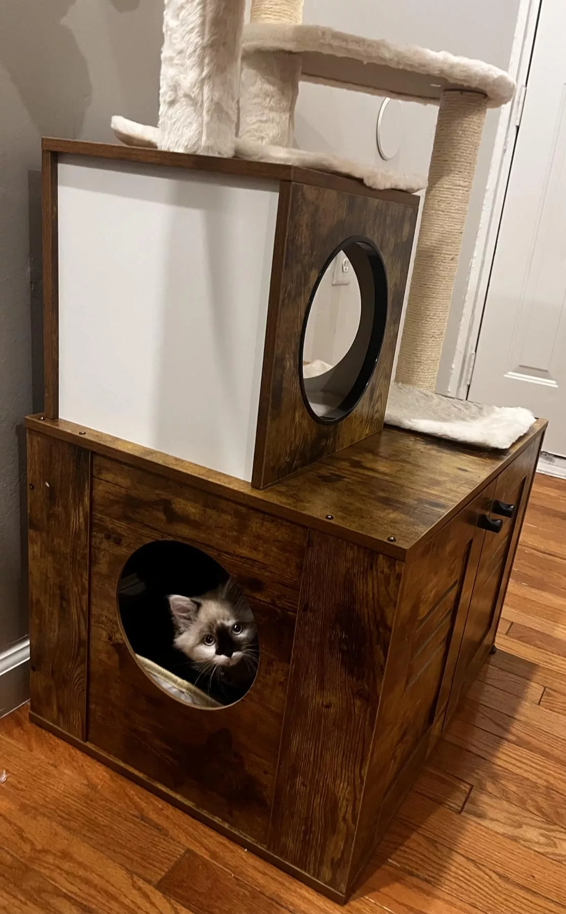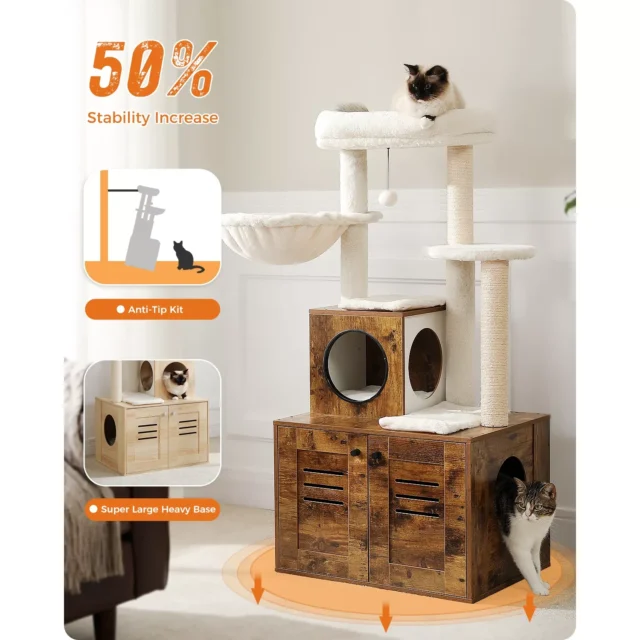 Luxury Wood Cat Tower with Condo, Scratching Posts & Foldable Litter Box