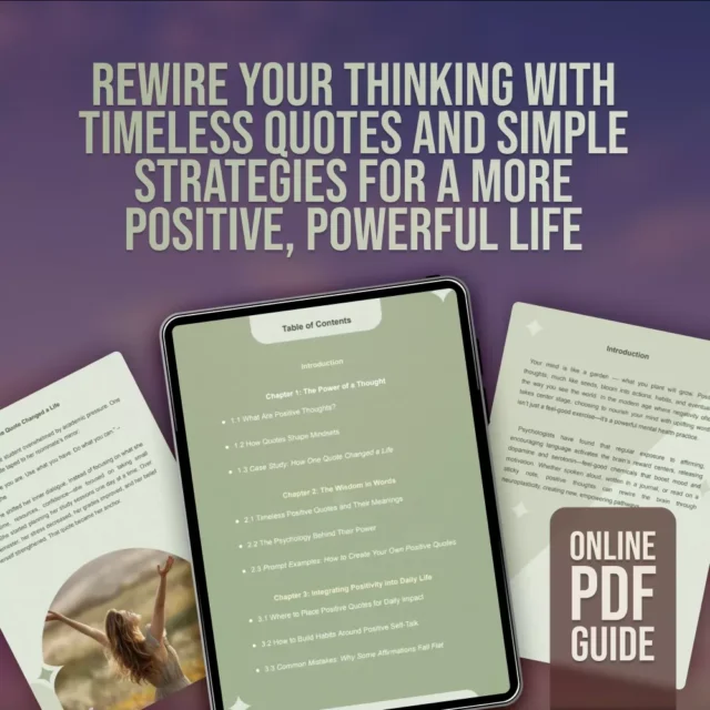 Discover the impact of a single thought and how it can shift your mindset, mood, and motivation. Powerful Words, Positive Minds: A Guide to Living with Uplifting Thoughts is a beautifully designed digital guide filled with transformative insights, inspiring positive thoughts quotes, and actionable tips to help you build a more empowered, optimistic life. Whether you’re just starting your self-growth journey or looking to deepen your daily practice, this guide will inspire you to make positivity a habit.