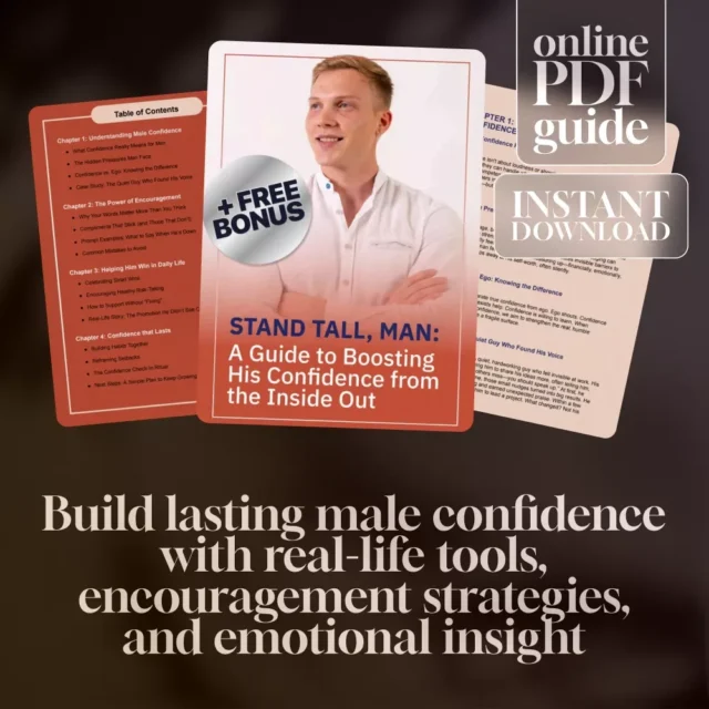 Whether he’s quietly struggling or simply needs a push to thrive, “Stand Tall, Man: A Guide to Boosting His Confidence from the Inside Out” is the digital guide that shows you how to boost a man’s confidence in real, lasting ways. Designed for partners, friends, or anyone wanting to support the men in their lives, this guide goes beyond clichés and digs into the emotional core of male self-belief. With relatable stories, practical tools, and heartfelt insights, this empowering read is your go-to resource for making a real difference—without overstepping or “fixing” him.